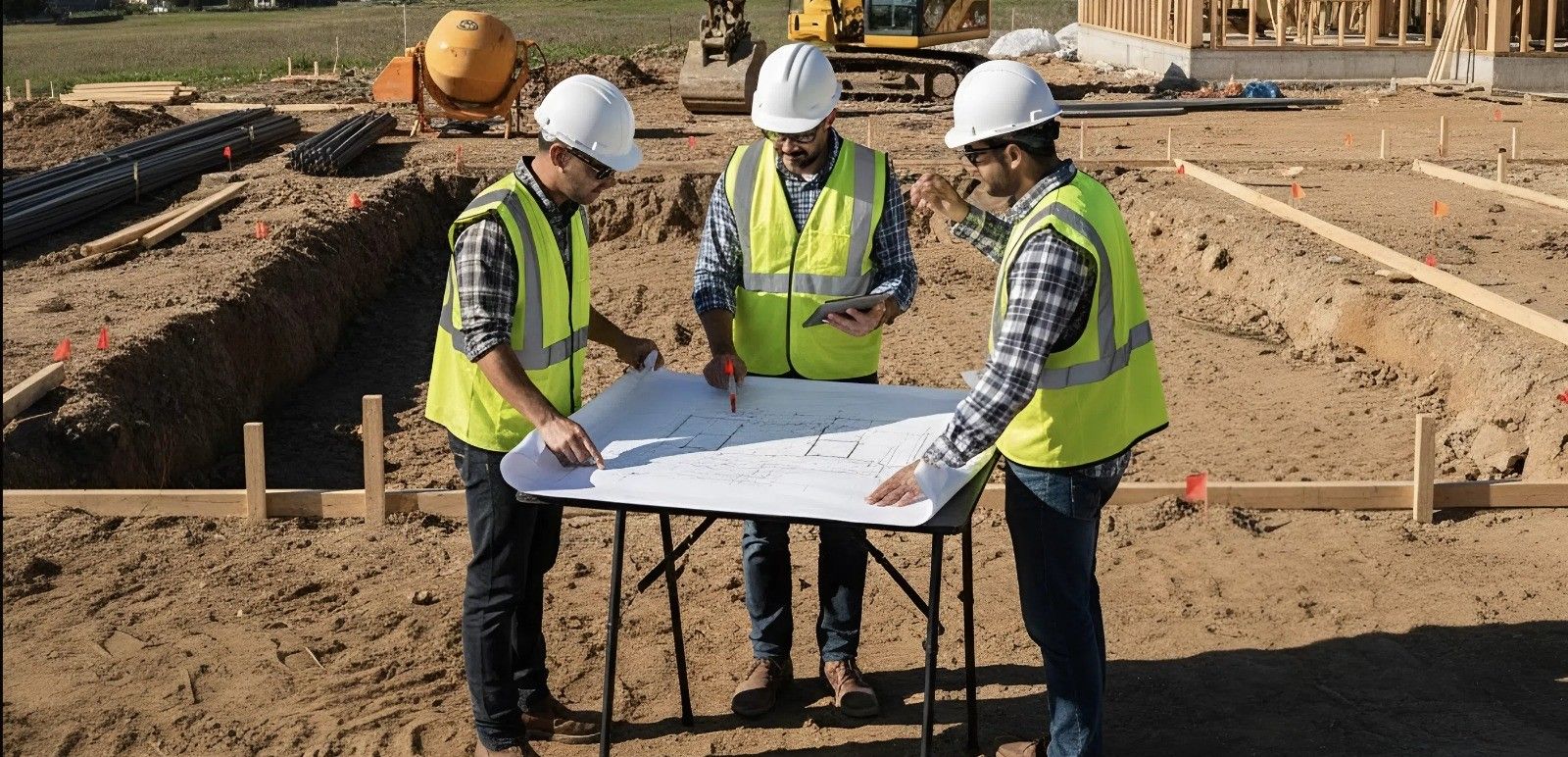 Для земляных и бетонных работ используем свою спецтехнику: экскаваторы, погрузчики, бетонные насосы, самосвалы. Это позволяет выходить на объект в нужный день и не зависеть от сторонних подрядчиков.