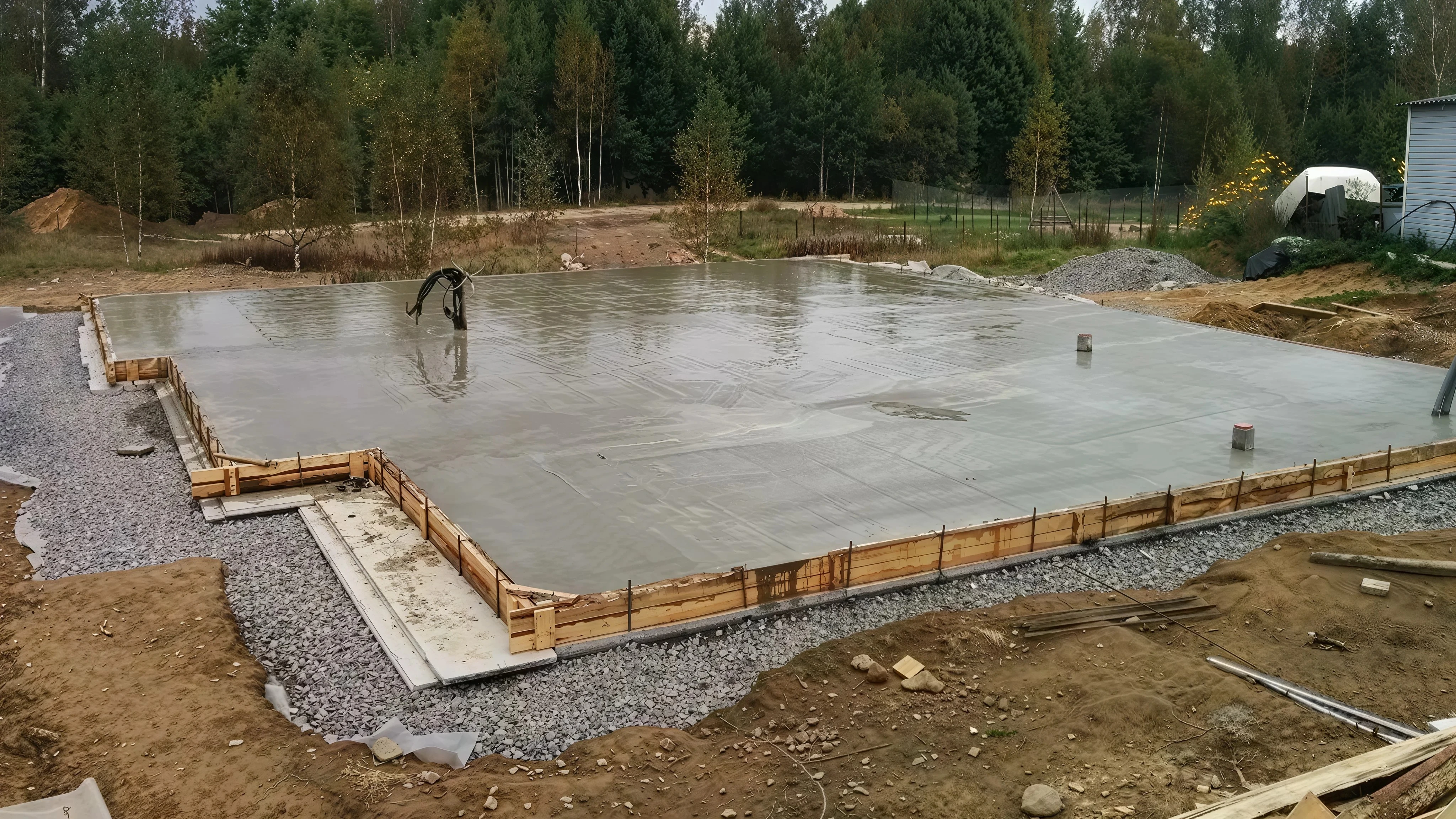 Мы строим основания под частные дома, коттеджи и промышленные здания. В галерее собрали реальные объекты: от подготовки участка и опалубки до заливки плиты и гидроизоляции.